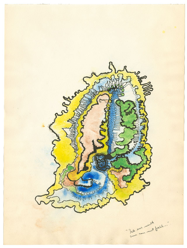 In 2009 Ida Applebroog’s (born 1929) assistants found a box marked “Mercy Hospital.” Inside was a series of drawings the artist made nearly 50 years ago, during a period of institutionalization after suffering a debilitating breakdown in San Diego in 1969. During this tumultuous period, Applebroog, by her own account, “withdrew from the world entirely, for a period hardly able to speak at all.” Instead she turned to drawing, producing works in graphite, India ink and watercolors, at times accompanied by text from authors such as Kafka and Freud.