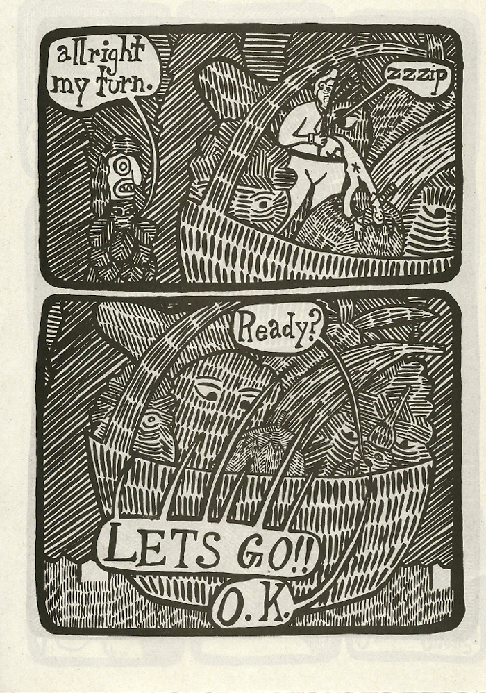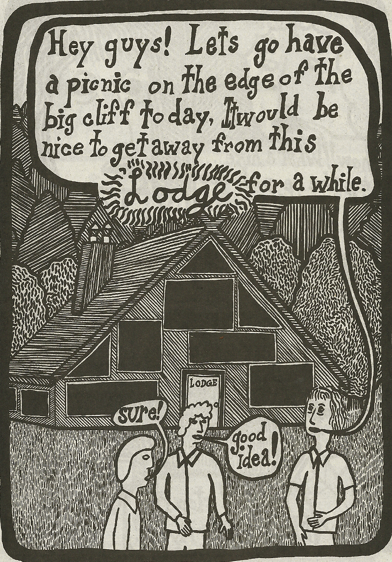 Jonathan Petersen's work has long been a favorite of artists like Marc Bell, Keith Jones and Jeff Ladouceur. A sculptor, image maker and cartoonist, Petersen's comics are propelled by a strong narrative engine: characters move abruptly from scene to scene and new personalities are introduced as old ones are unceremoniously tossed aside. Petersen draws his cast and his scenery with great feeling and stark compositions that at first glance feel like a comforting space for the eye to enter into---but closer inspection reveals a complicated world that feels both alien and drably familiar.