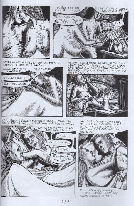 I cannot recommend this enough, although I have to say it's not for everyone, as there is a lot of graphic sex and violence here that many may find too intense. There are so many crime and sex comics out there, but so few that actually portray things as well as Smith has done here.Nothing here is oversold for cheap shock effect, quite the opposite in fact. There's quite a bit of mayhem, but it feels real because it's not played for laughs, but instead comes off as sometimes sad, sometimes unpredictable, sometimes moving, sometimes sickening. Truly lived in rather than a pose, the events speak for themselves, moments of quiet, real feeling, great stuff.